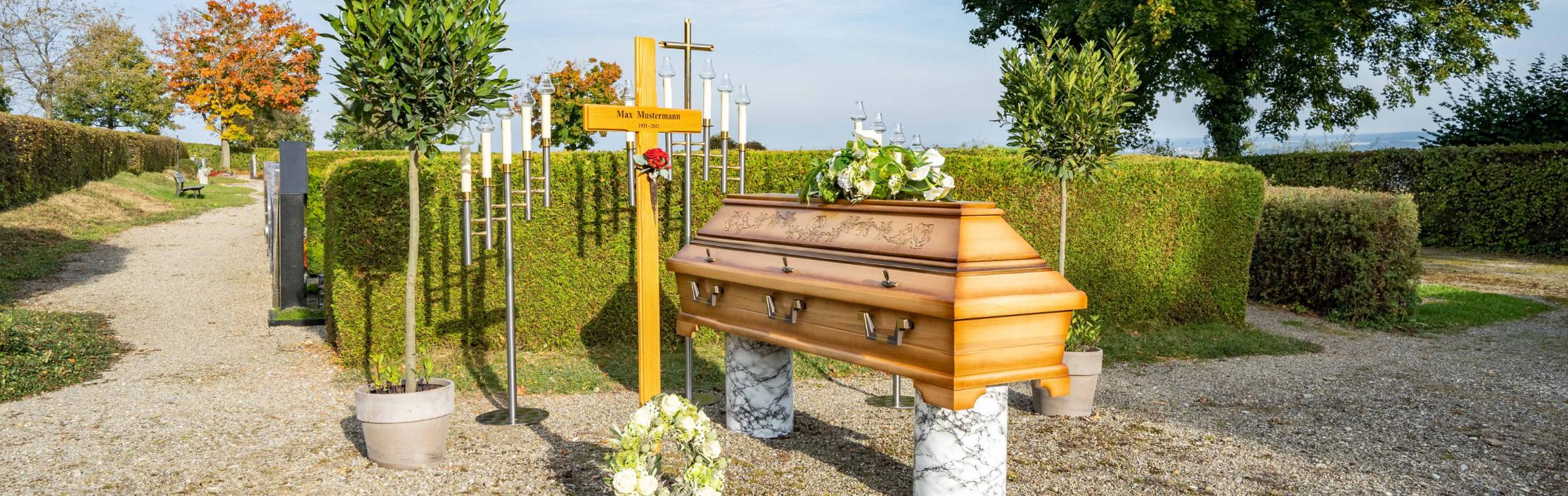 Bei Feuerbestattungen besteht trotzdem die Möglichkeit eine Aussegnungsfeier mit einem Geistlichen am Sarg auf einem Friedhof zu gestalten oder auch den Sarg in unserem Verabschiedungsraum segnen zu lassen. Nach der Verabschiedung am Sarg kann dann die Einäscherung sowie die Planung der Trauerfeier mit anschließender Urnenbeisetzung erfolgen.