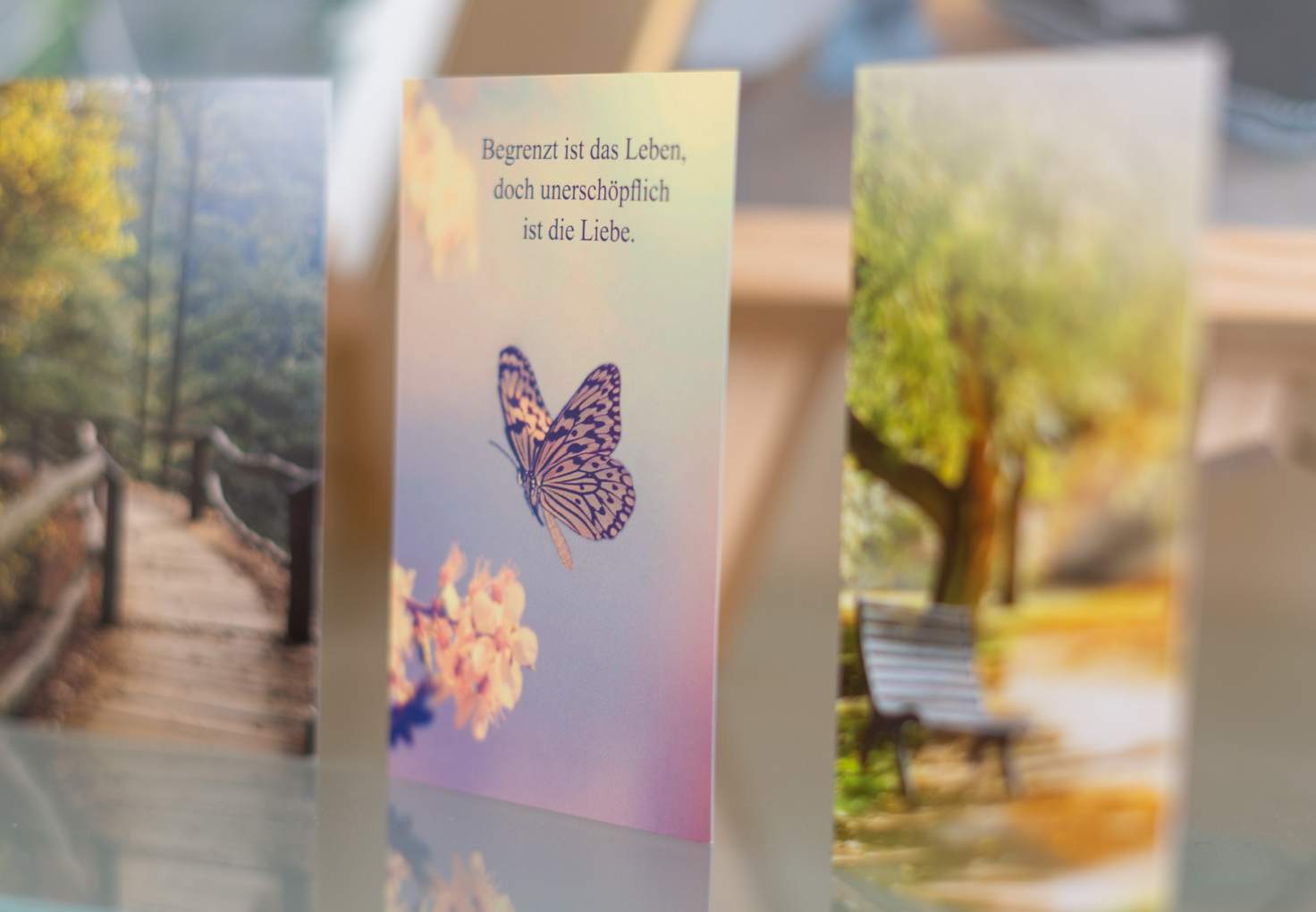 Hinzu kommen die Gestaltung von Traueranzeigen und Trauerdruck, die Organisation der Bestattungsfeier, inklusive Musik und Dekoration sowie die Kommunikation mit Behörden, Versicherungen (z.B. Rentenkasse, u.s.w.), Kirchengemeinden, Floristen, Zeitungsverlag und der Gaststätte für die Kaffeetafel. Wir arbeiten mit den Friedhofsverwaltungen besonders eng zusammen, um für immer die passende Grabstätte möglich zu machen. Außerdem informieren wir Sie kostenlos und unverbindlich zu allen Fragen der Bestattungsvorsorge.