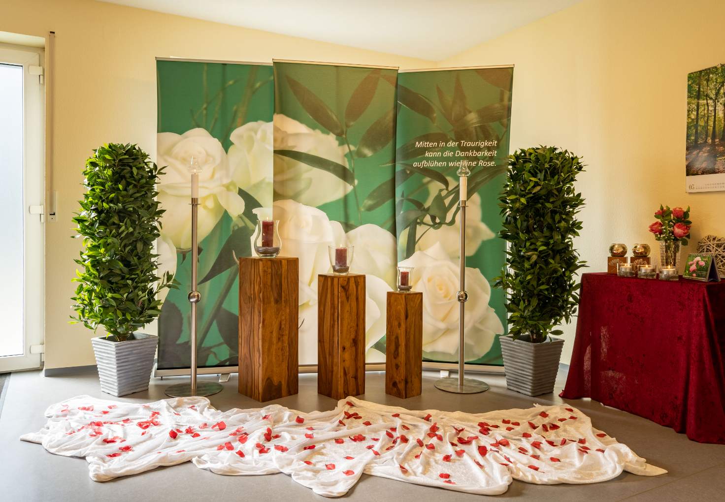Die Beratungs- und Abschiedsräume sowie unsere Versorgungsräume sind modern ausgestattet. Hier können Sie in Ruhe unsere Beratung zu allen Fragen rund um die Beisetzung, Trauerfeier und zur Bestattungsvorsorge in Anspruch nehmen, alle notwendigen Entscheidungen treffen und aus vielen verschiedenen Produkten in unserer Ausstellung wählen.